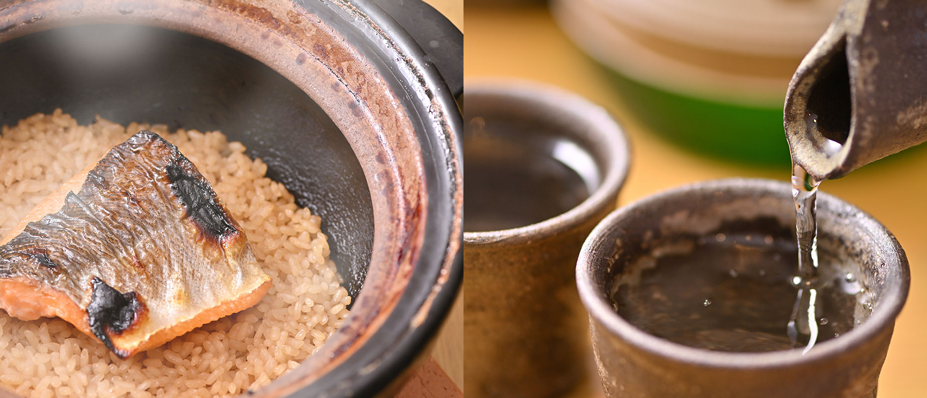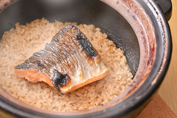 いよもんの田んぼで採れたコシヒカリと自慢のお魚を伊賀焼の土鍋で炊き上げた、素材の味を生かした自信の一品です。